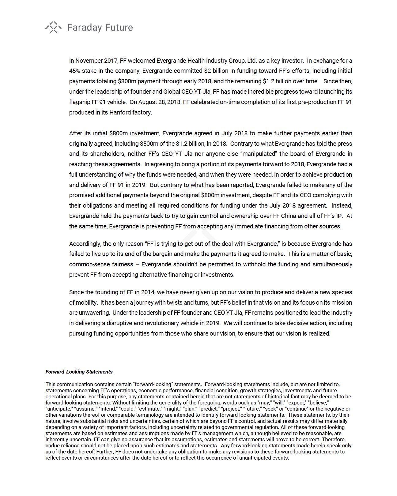 法拉第未來今日發(fā)布聲明稱,試圖擺脫恒大的唯一原因是,恒大沒能夠履行承諾和支付同意的款項。恒大不應該一邊扣留款項,一邊阻止FF接受其他投資。