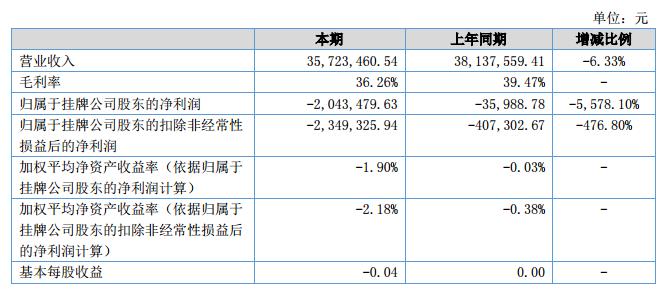 報告期內(nèi),公司實現(xiàn)營業(yè)收入35,723,460.54元,較上年同期38,137,559.41元減少了6.33%;實現(xiàn)利潤總額-1,990,676.54元,凈利潤-2,043,479.63元,分別較上年同期減少了13,180.31%和5,578.10%(其中,母公司實現(xiàn)營業(yè)收入34,536,694.34元,實現(xiàn)凈利潤-1,898,832.26元)。公司營業(yè)利潤減少主要由于產(chǎn)品毛利較去年同期減少2,100,326.59元。?