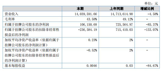 報(bào)告期內(nèi),公司實(shí)現(xiàn)營(yíng)業(yè)收入1,403.96萬(wàn)元,比上年同期減少4.58%;公司實(shí)現(xiàn)凈利潤(rùn)10.62萬(wàn)元,比上年同期下降85.37%。?