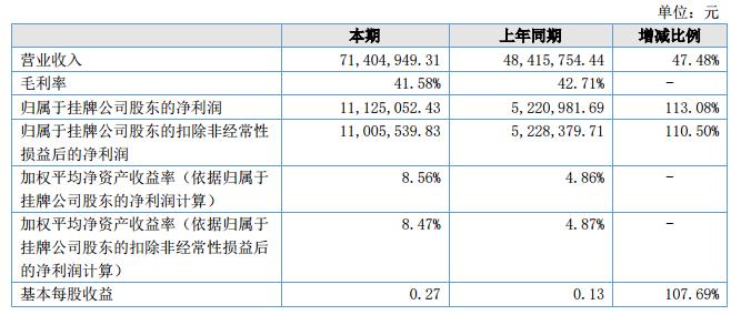 報告期內(nèi),公司實現(xiàn)營業(yè)收入71,404,949.31元,較上年同期營業(yè)收入48,415,754.44元,同比增長47.48%,主要原因是公司所處行業(yè)顯著復蘇,工程機械行業(yè)更新?lián)Q代和新增需求,“一帶一路”基建需求刺激,以及國內(nèi)基礎設施投資建設剛需所致;報告期內(nèi)實現(xiàn)利潤總額13,095,099.29元,實現(xiàn)凈利潤11,012,334.84元,產(chǎn)品銷售毛利率為41.58%,較上年同期毛利率42.71%,降低1.13%,毛利下降的原因主要是因為材料成本增加。?