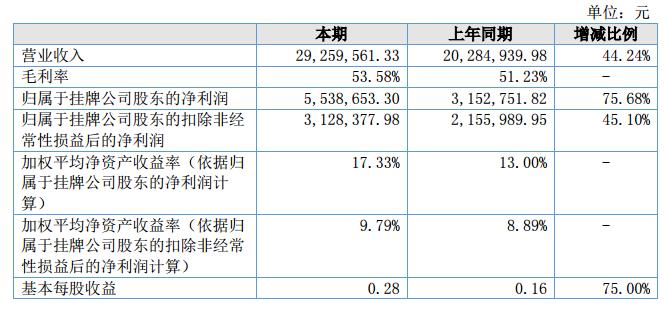 報(bào)告期內(nèi),本期營(yíng)業(yè)成本為1358.33萬元,較上年同期上升37.31%,主要系本期公司較上年同期銷售收入上升44.24%,相應(yīng)成本增加所致;本期凈利潤(rùn)為552.74萬元,較上年同期上升68.75%,主要原因系營(yíng)業(yè)收入大幅增加,導(dǎo)致凈利潤(rùn)也有所增加,同時(shí)獲取政府補(bǔ)貼部分同比增長(zhǎng)58.91%所致。?