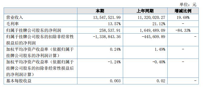 報告期內(nèi),公司實(shí)現(xiàn)營業(yè)收入1,354.75萬元,比上年同期增長19.68%;掛牌公司股東的凈利潤25.85萬元,比上年同期下降84.33%。?