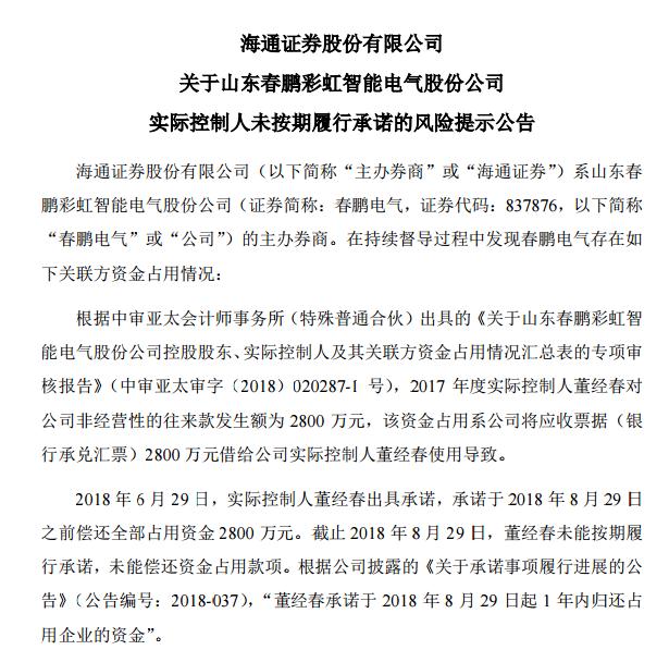 據(jù)主辦券商海通證券介紹,根據(jù)中審亞太會計師事務(wù)所(特殊普通合伙)出具的《關(guān)于山東春鵬彩虹智能電氣股份公司控股股東、實際控制人及其關(guān)聯(lián)方資金占用情況匯總表的專項審 核報告》,2017 年度實際控制人董經(jīng)春對公司非經(jīng)營性的往來款發(fā)生額為 2800 萬元,該資金占用系公司將應(yīng)收票據(jù)(銀行承兌匯票)2800 萬元借給公司實際控制人董經(jīng)春使用導(dǎo)致。