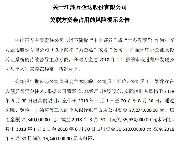 主辦券商中山證券表示,在對(duì)萬企達(dá) 2018 年半年報(bào)的審核過程中發(fā)現(xiàn)公司與個(gè)人往來存在異常,才發(fā)現(xiàn)巨額資金占用的。
