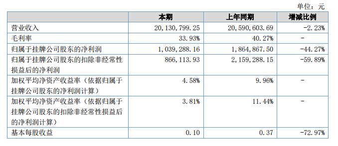 報(bào)告期內(nèi),公司實(shí)現(xiàn)營(yíng)業(yè)收入20,130,799.25元,同比減少2.23%;營(yíng)業(yè)成本為13,301,002.15元,同比增長(zhǎng)8.16%,主要原因是原材料大幅上漲所致;歸屬于掛牌公司股東的凈利潤(rùn)為1,039,288.16元,同比減少44.27%,主要原因是報(bào)告期內(nèi),各項(xiàng)原材料大幅上漲,導(dǎo)致毛利率減少所致。?