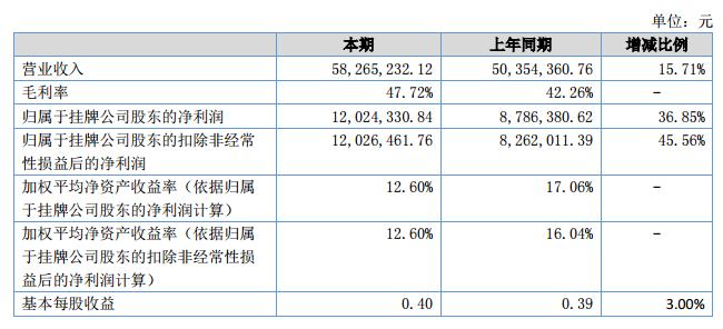 公司在報告期內(nèi)的主營業(yè)務(wù)收入為58,265,232.12元比上年同期增長15.71%;營業(yè)成本為30,462,760.78元,比上年度同期增長4.78%;歸屬于母公司的凈利潤為12,024,330.84元,比上年同期增長36.85%。?