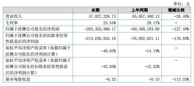 報告期內(nèi),公司實現(xiàn)營業(yè)收入47,827,226.73元,較去年同期減少26.48%;歸屬于掛牌公司股東的凈利潤為-203,355,900.17元,較去年同期減少127.49%;截止2018年6月30日,公司總資產(chǎn)為2,952,314,560.12元,較去年同期增加92.77%;歸屬于掛牌公司股東的凈資產(chǎn)為1,153,215,975.42元,較去年同期增加150.49%。?