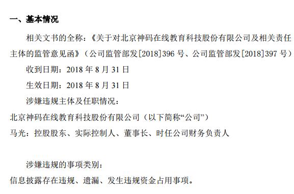 挖貝網(wǎng) 9月4日消息 ,新三板掛牌神碼在線(834748) 控股股東、實際控制人、董事長馬光因信息信披違規(guī)、遺漏、違規(guī)占用資金,被全國股轉(zhuǎn)公司出具監(jiān)管意見函。