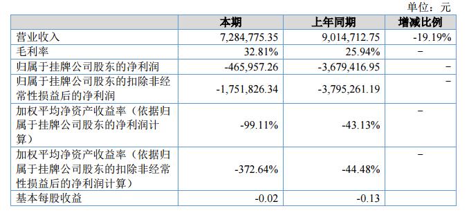 報(bào)告期公司營(yíng)業(yè)收入728.48萬(wàn)元,較上年同期減少172.99萬(wàn)元,同比下降19.19%;歸屬于母公司所有者的凈利潤(rùn)為-46.60萬(wàn)元,較上年同期減虧321.35萬(wàn)元。?