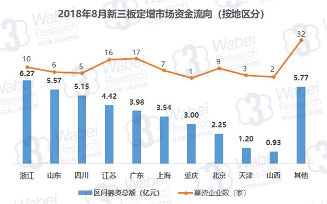 上月,新三板定增市場(chǎng)上,吸引資金排名前三的地區(qū)是浙江、山東和四川,三地共募資16.99億元,占新三板企業(yè)募資總額的40.4%。