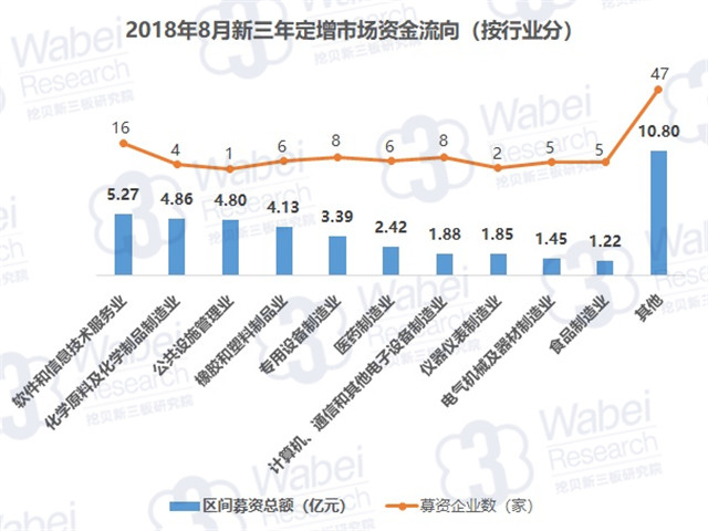 上月,新三板定增市場(chǎng)上,吸引資金最多的行業(yè)是軟件和信息技術(shù)服務(wù)業(yè),共募資5.27億元;其次是化學(xué)原料及化學(xué)制品制造業(yè),募資4.86億元。另外,募資金額超4億元的行業(yè)還有公共設(shè)施管理業(yè)、橡膠和塑料制品業(yè),分別募資4.80億元、4.13億元。