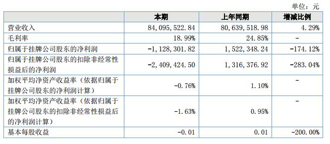 報告期內(nèi),公司保持經(jīng)營規(guī)模平穩(wěn)增長,實現(xiàn)營業(yè)收入84,095,522.84元,較去年同期增長4.29%。公司本期實現(xiàn)凈利潤-505,001.30元,較去年同期減少127.61%,主要原因是公司人力成本持續(xù)增長而產(chǎn)品價格下降,毛利率下降明顯,利潤降低,經(jīng)營壓力增大。