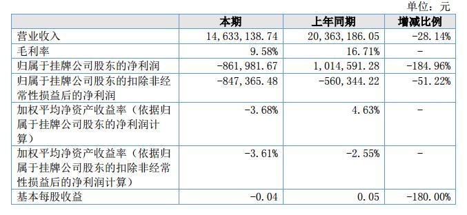 報告期內(nèi)公司實(shí)現(xiàn)營業(yè)收入1,463.31萬元,營業(yè)成本1,323.15萬元,較上期營業(yè)成本減少了372.95萬元,減少比例為21.99%,凈利潤-86.20萬元,較上期凈利潤101.46萬元減少了187.66萬元,減少比例為184.96%。