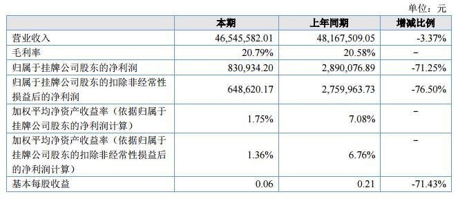 報告期內(nèi),公司實現(xiàn)營業(yè)收入4,654.56萬元,較上年同期下降3.37%;公司實現(xiàn)利潤77.36萬元,相比上年同期下降207.56萬元,下降了72.85%。?