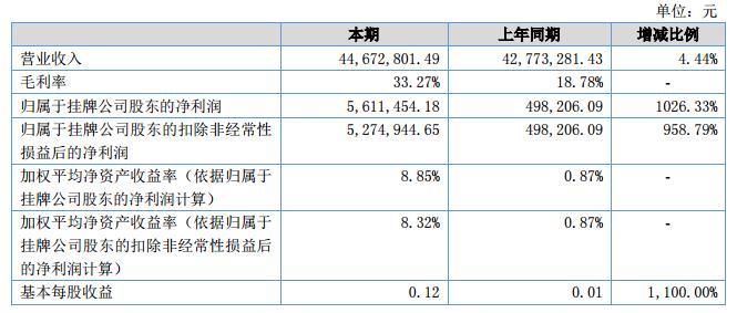 截至本期末公司資產(chǎn)總額為83,446,765.82元,較期初88,409,936.95元下降5.61%。公司本期實現(xiàn)營業(yè)收入44,672,801.49元,實現(xiàn)利潤5,611,454.18元,較上期增長1026.33%。報告期內(nèi)公司加大非標(biāo)產(chǎn)品的投入力度,提升公司總體毛利率,提升管理水平控制費用支出,實現(xiàn)利潤的大幅提升。?