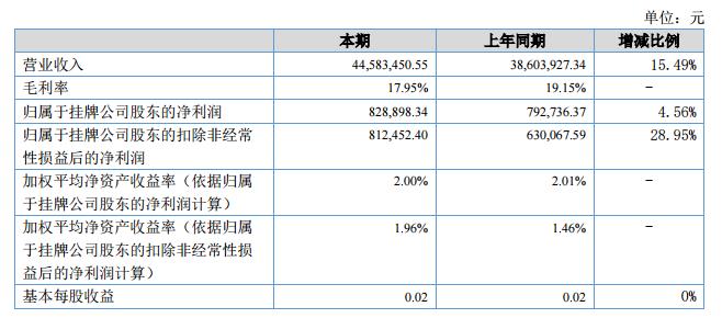 報告期內(nèi)公司實現(xiàn)銷售收入44,583,450.55元,較上年同期的38,603,927.34元增加5,979,523.21元,增加15.49%。公司2018年上半年和2017年上半年分別實現(xiàn)凈利潤828,898.34元和792,736.37元,同比增加4.56%。?