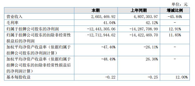 報告期內(nèi)營業(yè)收入2,603,469.92元,較上年同期減少45.84%;營業(yè)成本1,534,876.07元,較上年同期減少44.83%;利潤總額-12,452,358.31元,較上年同期降低虧損12.78%;凈利潤-12,443,305.06元,較上年同期降低虧損12.91%,系報告期內(nèi)公司為降低運營成本及費用支出,導(dǎo)致業(yè)務(wù)規(guī)??s小。?
