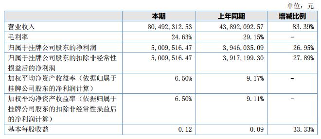 報(bào)告期內(nèi),2018年上半年實(shí)現(xiàn)銷售收入8049.23萬(wàn)元,比去年同期增長(zhǎng)83.39%;實(shí)現(xiàn)凈利潤(rùn)500.95萬(wàn)元,比去年同期增長(zhǎng)26.95%。?