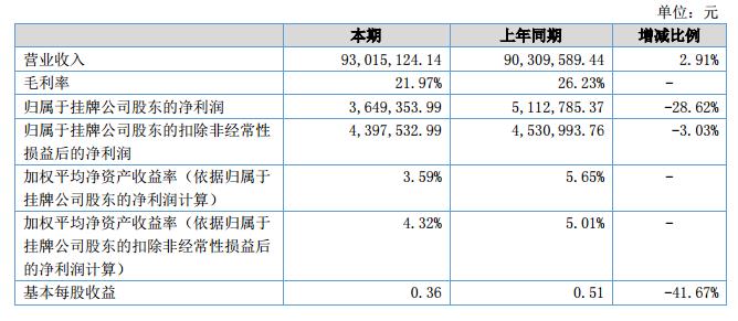 報(bào)告期內(nèi)公司實(shí)現(xiàn)營(yíng)業(yè)收入93,015,124.14元,上年同期營(yíng)業(yè)收入為90,309,589.44元,較上年同期增2.91%;報(bào)告期內(nèi)歸屬于掛牌公司股東的凈利潤(rùn)為3,649,354.00元,上年同期歸屬于掛牌公司股東的凈利潤(rùn)為5,112,785.37元,較上年同期下降28.62%。?