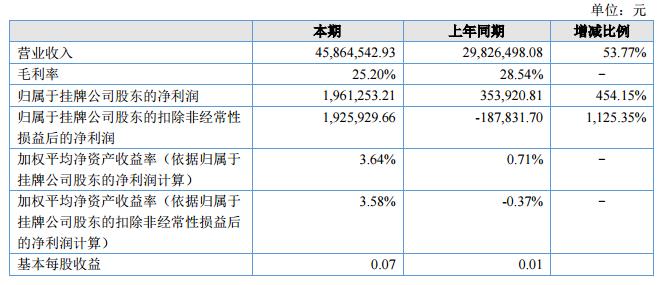 報告期內(nèi),公司實現(xiàn)主營業(yè)務(wù)收入4,586.45萬元,與去年同期相比增長53.77%;營業(yè)成本3,430.72萬元,與去年同期相比增長60.95%;實現(xiàn)歸屬于股東的凈利潤196.13萬元,與去年同期相比增長454.15%。?