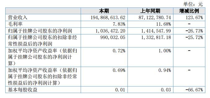 報告期內實現營業(yè)收入194,868,613.62元,同比增長123.67%,營業(yè)成本179,617,764.16元,同比增長133.43%;實現凈利潤1,461,571.28元,同比下降36.33%。?