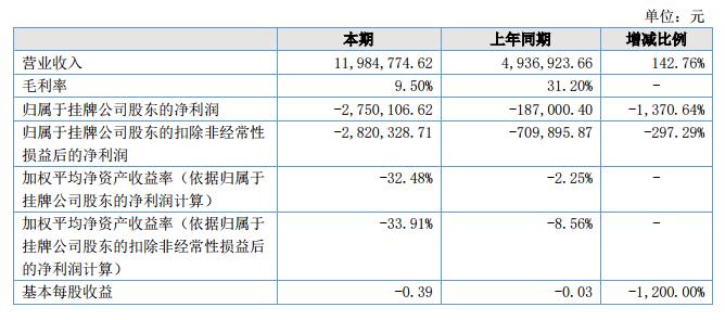 報告期內(nèi),公司的主營業(yè)務(wù)收入:2016年為1242.13萬元、2017年為1479.70萬元、2018年6月為1198.48萬元,總體上穩(wěn)健走高;受國內(nèi)整體資金面緊張、消費指數(shù)下降、居民和企業(yè)需求逐漸下降,自去年年底虧損至今。?