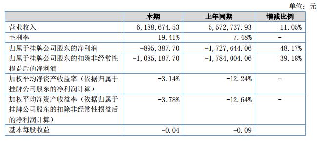 報告期內,公司實現(xiàn)營業(yè)收入6,188,674.53元,比上年同期增長11.05%;結轉營業(yè)成本4,987,211.25元,較上年下降3.27%;實現(xiàn)凈利潤-895,387.70元,比上年同期增長48.17%。?