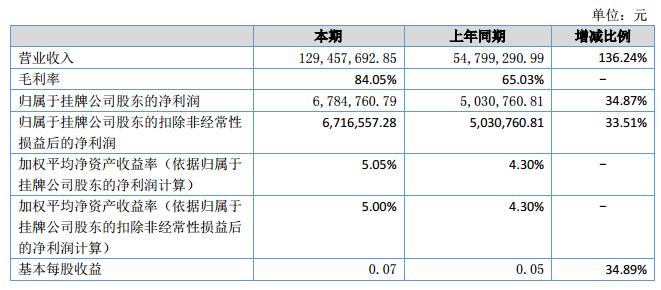 報(bào)告期內(nèi),公司實(shí)現(xiàn)營(yíng)業(yè)收入129,457,692.85元,同比增加74,658,401.86元,增幅為136.24%;?凈利潤(rùn)為6,784,760.79元,同比增加1,753,999.98元,增幅為34.87%。?