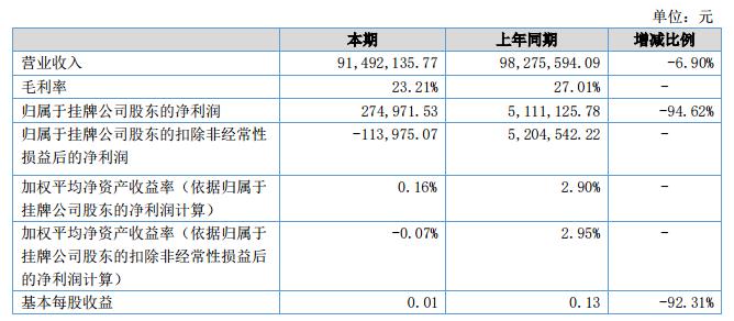 報告期內(nèi)公司總資產(chǎn)305,763,876.15元,同比增長14.74%,歸屬于掛牌公司凈資產(chǎn)168,238,681.42元,同比上年增長-0.20%。報告期內(nèi)實現(xiàn)銷售收入91,492,135.77元,同比上年下降-6.90%,歸屬于掛牌公司股東的凈利潤274,971.53元,同比增長-94.62%。?