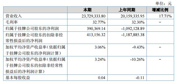 報告期內(nèi)公司實現(xiàn)營業(yè)收入2,372.93萬元,同比增長17.71%,增長原因系公司本期產(chǎn)品銷量增加;本期營業(yè)成本1,595.37萬元,同比增加16.89%,營業(yè)成本增長幅度與收入增長幅度相符;本期實現(xiàn)凈利潤39.04萬元。?