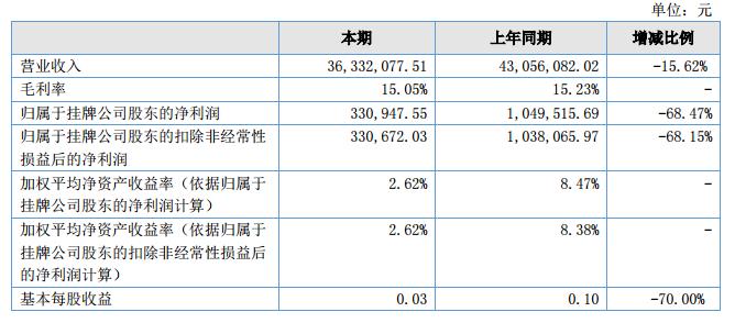 報(bào)告期內(nèi)公司實(shí)現(xiàn)營(yíng)收3,633.21萬元,同比減少15.62%;公司實(shí)現(xiàn)歸屬于掛牌股東的凈利潤(rùn)32.74萬元,同比減少67.65%。?