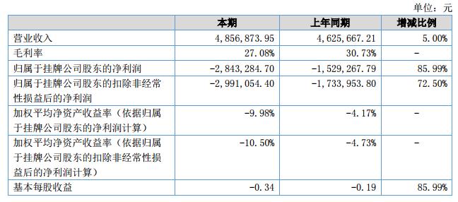 報(bào)告期內(nèi),公司經(jīng)營(yíng)業(yè)績(jī)平穩(wěn)增長(zhǎng),營(yíng)業(yè)收入485.69萬(wàn)元,較去年同期增長(zhǎng)5%;營(yíng)業(yè)成本842.20萬(wàn)元,較去年同期增長(zhǎng)27.53%;歸屬于掛牌公司股東的凈利潤(rùn)虧損284.43萬(wàn)元。?