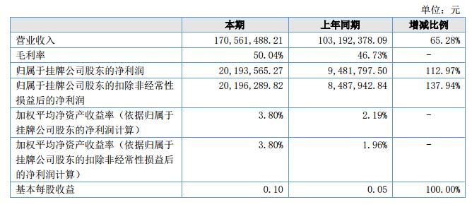 公司實(shí)現(xiàn)營業(yè)收入170,561,488.21元,比去年同期增長65.28%,實(shí)現(xiàn)凈利潤24,953,180.57元,比去年同期增長135.32%,實(shí)現(xiàn)歸屬于公司股東的凈利潤20,193,565.27元,比去年同期增長112.97%。?