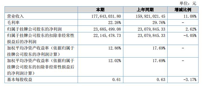 報(bào)告期內(nèi),公司實(shí)現(xiàn)營業(yè)收入17,764.30萬元,較上年同期增長11.08%;公司實(shí)現(xiàn)凈利潤2,368.55萬元,較上年同期增加2.62%。?