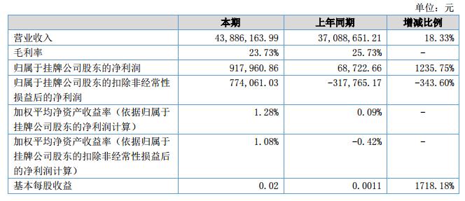 報(bào)告期內(nèi)公司營(yíng)業(yè)務(wù)收入為43,886,163.99元,同期增長(zhǎng)18.33%;營(yíng)業(yè)成本為33,472,973.28元,同期增漲21.52%;歸屬于母公司的凈利潤(rùn)為917,960.86元,同期增漲1235.75%。