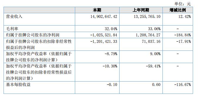 報告期內公司實現(xiàn)營業(yè)收入14,902,647.42元,較上年同期增長12.43%;報告期內實現(xiàn)凈利潤-1,003,939.21元,比上年同期下降了180.74%。
