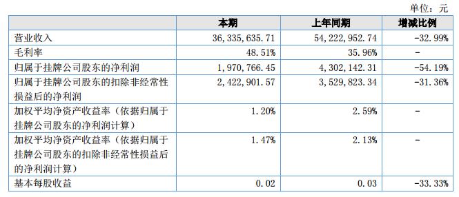 報(bào)告期內(nèi),公司實(shí)現(xiàn)營業(yè)收入36,335,635.71元,同比下降32.99%;報(bào)告期內(nèi)公司實(shí)現(xiàn)凈利潤1,930,699.62元,同比下降54.67%。?