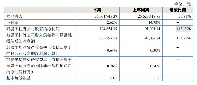 報告期內(nèi)公司營業(yè)收入35,061,945.39元,同比增長36.81%,營業(yè)成本30,637,124.17元,同比增長40.52%??鄢墙?jīng)營性損益后的凈利潤233,797,57元,同比增長153.95%。?