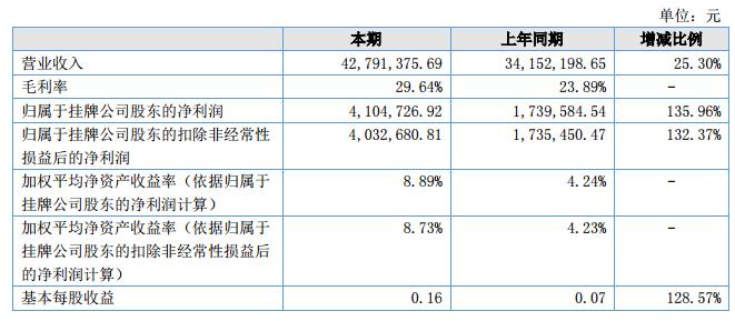 報(bào)告期內(nèi)公司營(yíng)業(yè)收入為4,279.14萬(wàn)元,較上年同期增長(zhǎng)25.30%;營(yíng)業(yè)成本3,010.66萬(wàn)元,較上年同期僅增長(zhǎng)15.82%;凈利潤(rùn)為410.47萬(wàn)元,較上年同期增長(zhǎng)135.96%。