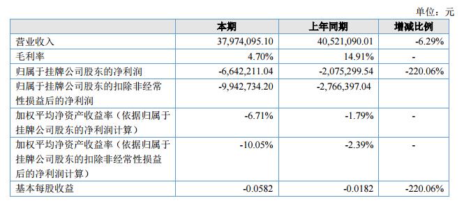 報(bào)告期內(nèi),公司實(shí)現(xiàn)營(yíng)業(yè)收入37,974,095.10元,較上年同期減少6.29%;報(bào)告期凈利潤(rùn)為-6,642,211.04,較上期減少4,566,911.50元。?