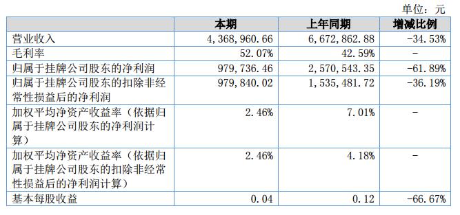 報告期內(nèi)公司主營業(yè)務收入4,368,960.66元,較上年同期減少34.53%;?實現(xiàn)凈利潤979,736.46元,較上年同期減少61.89%。?