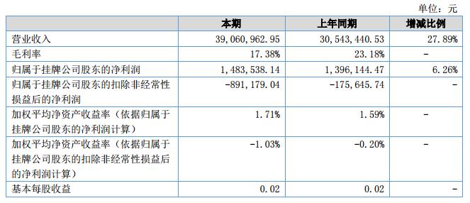報(bào)告期內(nèi),公司的經(jīng)營狀況繼續(xù)穩(wěn)步發(fā)展,上半年實(shí)現(xiàn)營業(yè)收入39,060,962.95元,與上年同期相比增長27.89%;扣除非經(jīng)常性損益后的凈利潤-891179.04元,與上年同期相比減少715533.3元。?