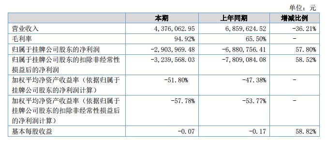 報(bào)告期內(nèi)公司實(shí)現(xiàn)營(yíng)業(yè)收入437.61萬元,同比減少36.21%;實(shí)現(xiàn)凈利潤(rùn)-290.40萬元,同比去年減虧57.8%。?