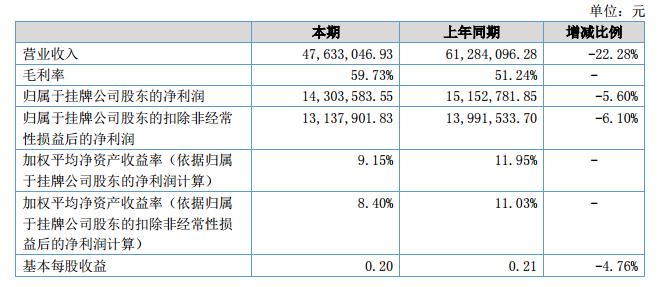 報告期內(nèi)公司實現(xiàn)營業(yè)收入4,763.3萬元,較去年同期同比減少22.28%;公司實現(xiàn)凈利潤1,430.36萬元,較去年同期同比減少5.6%。?
