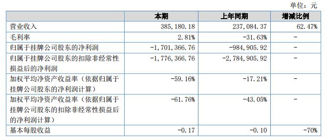 公司報告期內(nèi)主營業(yè)務收入為385,180.18元,較上年同期增長了62.47%;凈利潤為-1,701,366.76元,較上年同期增加虧損716,460.84元。?
