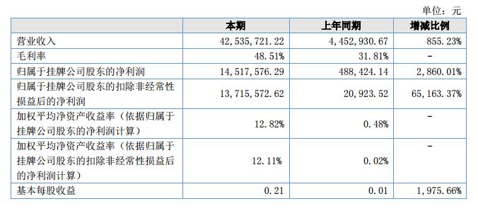 公司實現(xiàn)營業(yè)收入42,535,721.22元,較去年同期大幅增長了855.23%;公司凈利潤達到了14,517,576.29元,比去年同期大幅提高。
