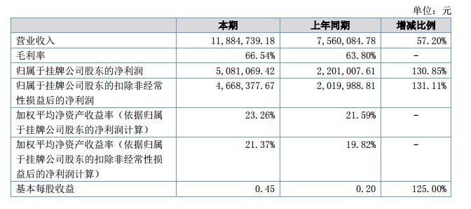 報告期內,公司實現營業(yè)收入1,188.47萬元,較去年同期增加了432.47萬元,同比增幅57.20%;報告期實現凈利潤508.11萬元,比上年同期增加了281.08萬元,增幅124%.