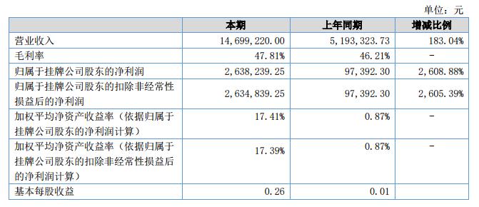 公司在報(bào)告期內(nèi)的主營(yíng)業(yè)務(wù)收入為14,699,220.00元,2017年同期主營(yíng)業(yè)務(wù)收入5,193,323.73元,比上年同期增長(zhǎng)9,505,896.27元,變動(dòng)比例為183.04%;報(bào)告期內(nèi)實(shí)現(xiàn)凈利潤(rùn)為2,638,239.25元,2017年同期實(shí)現(xiàn)凈利潤(rùn)97,392.30元,比上年同期增長(zhǎng)2,540,846.95元,變動(dòng)比例2,608.88%。?