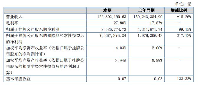 報(bào)告期公司實(shí)現(xiàn)營業(yè)收入122,802,190.63元,較上年同期下降18.26%;營業(yè)成本88,667,033.86元,較上年同期下降28.14%;毛利率27.8%,較上年同期增長9.93個(gè)百分點(diǎn);實(shí)現(xiàn)凈利潤8,604,103.85元,較上年同期增長99.55%。?