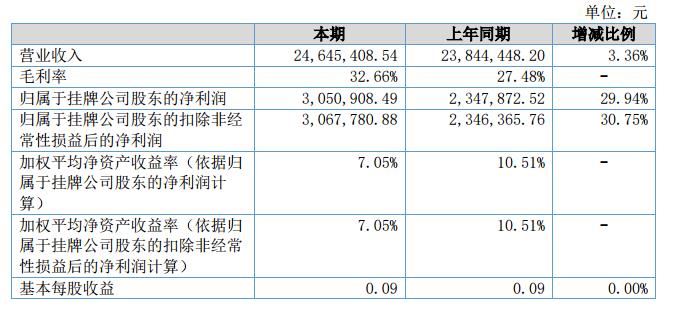 報(bào)告期內(nèi),公司實(shí)現(xiàn)營業(yè)收入2,464.54萬元,較2017年同期增長3.36%;公司實(shí)現(xiàn)凈利潤304.71萬元,較2017年同期增長31.83%。?